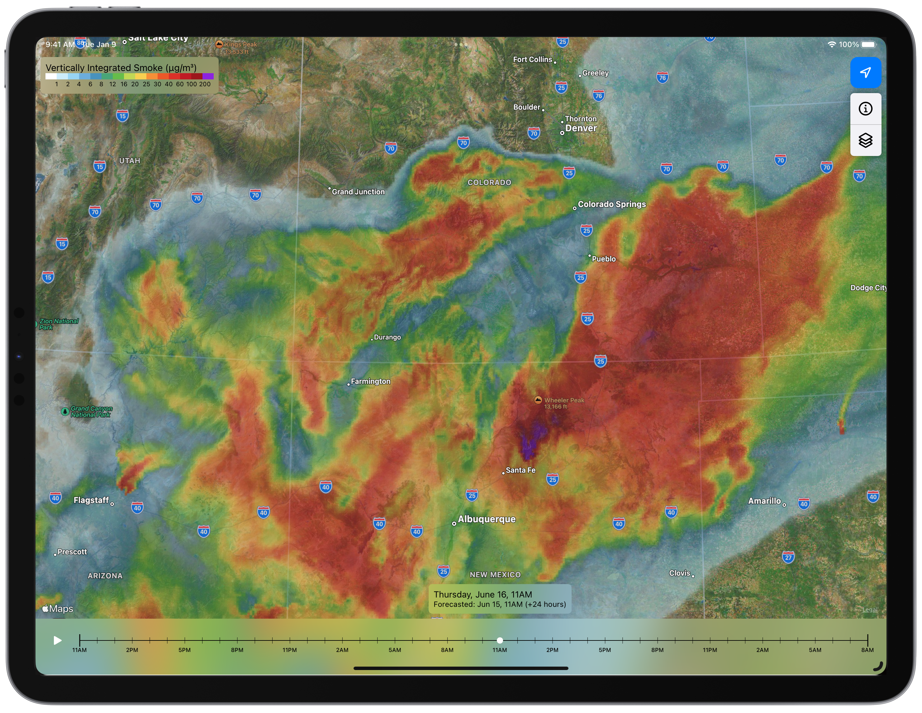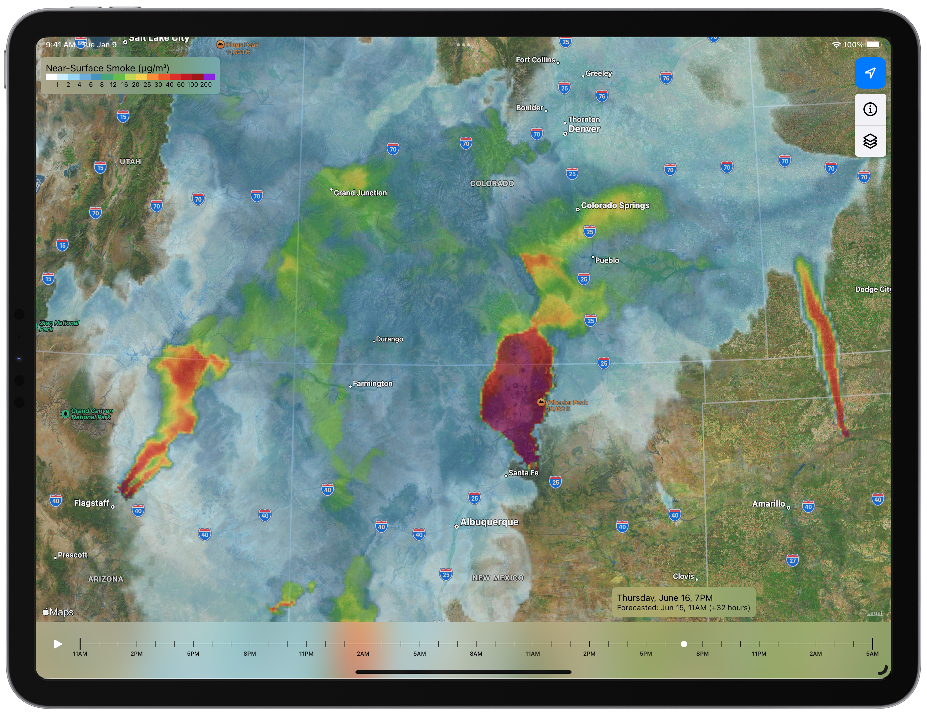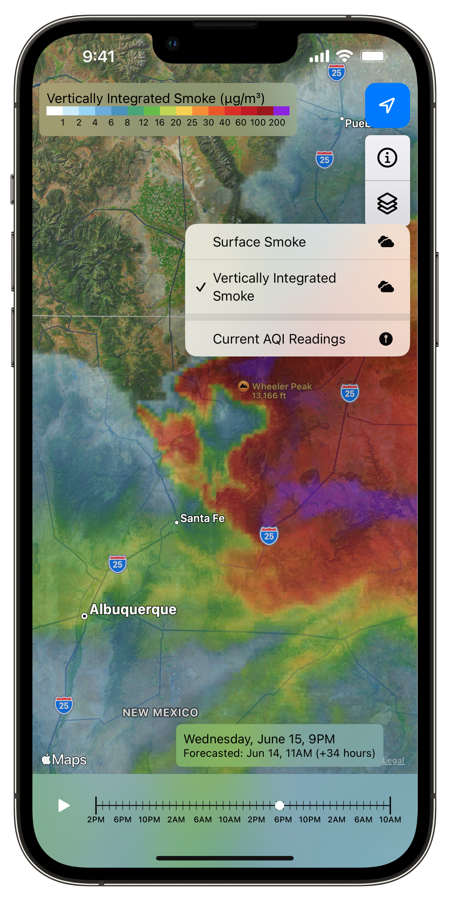 48-hour smoke prediction maps with hourly updates for accurate wildfire smoke tracking.